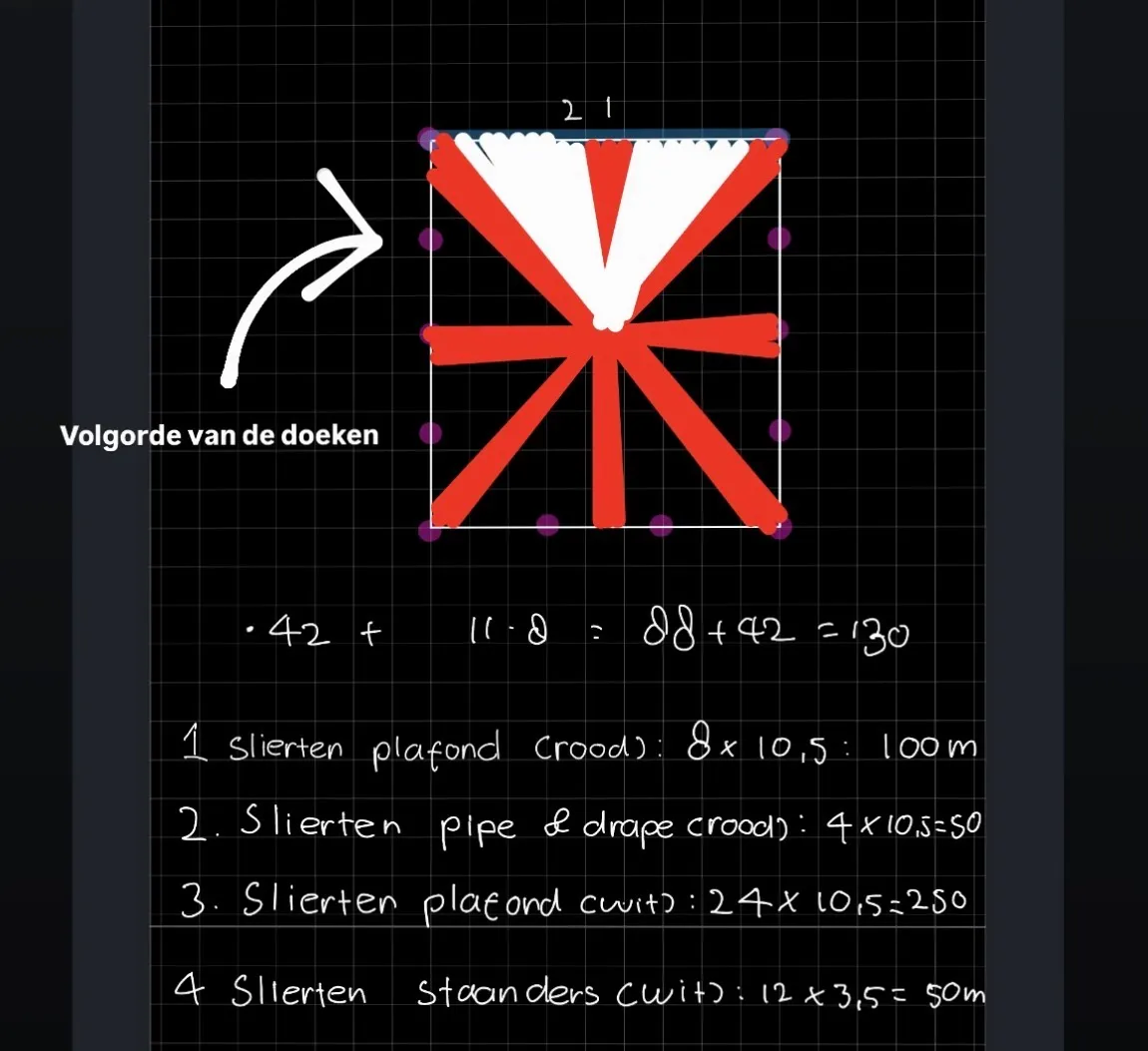 Op basis daarvan berekenden we hoeveel meter stof nodig was en welke combinatie van pipe & drape en truss-systemen passend zou zijn.