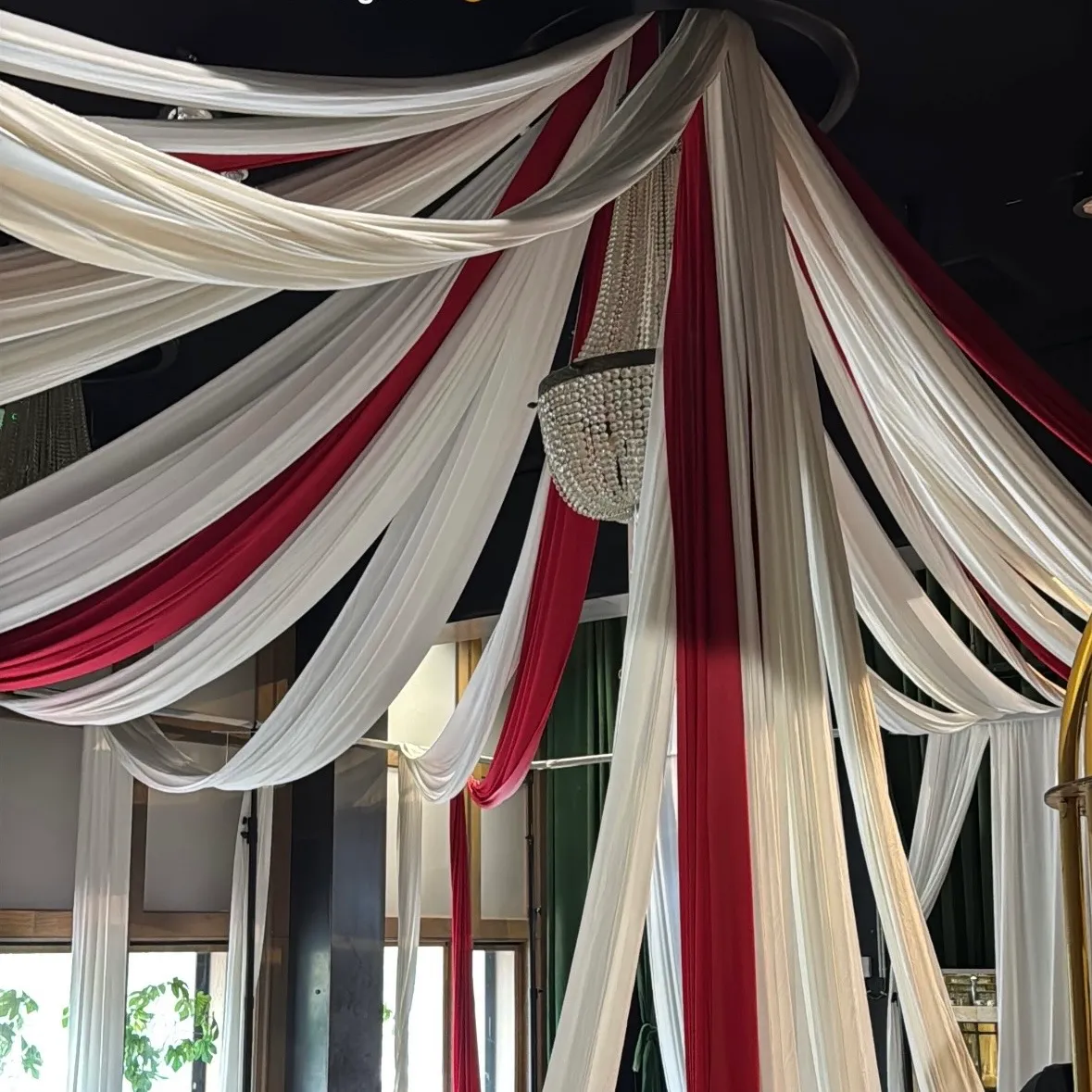 Rode en witte doeken liepen vanuit het midden naar buiten, waardoor het plafond een klassieke circusvorm kreeg — maar dan met een donker randje, passend bij het “haunted” thema.