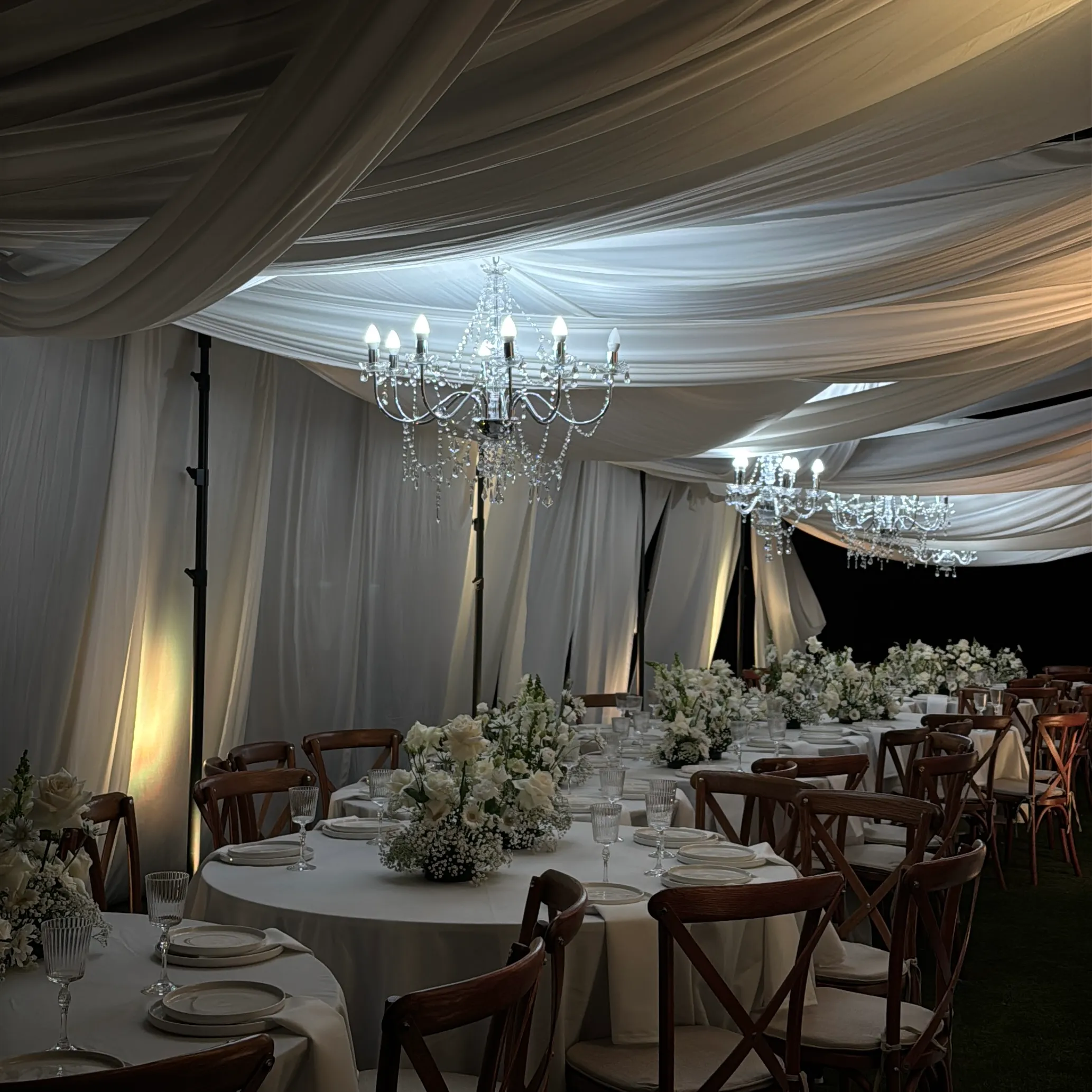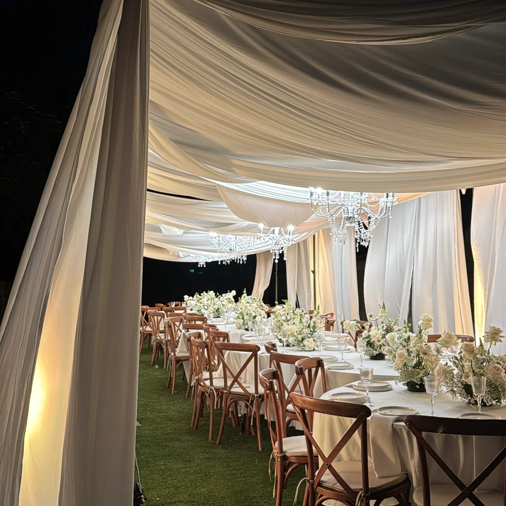 Voor de bruiloft van een Ajax-voetballer mochten wij een uniek draperings project realiseren in België. De setting vroeg om iets dat zowel groots als intiem aanvoelde — licht, romantisch en in balans.